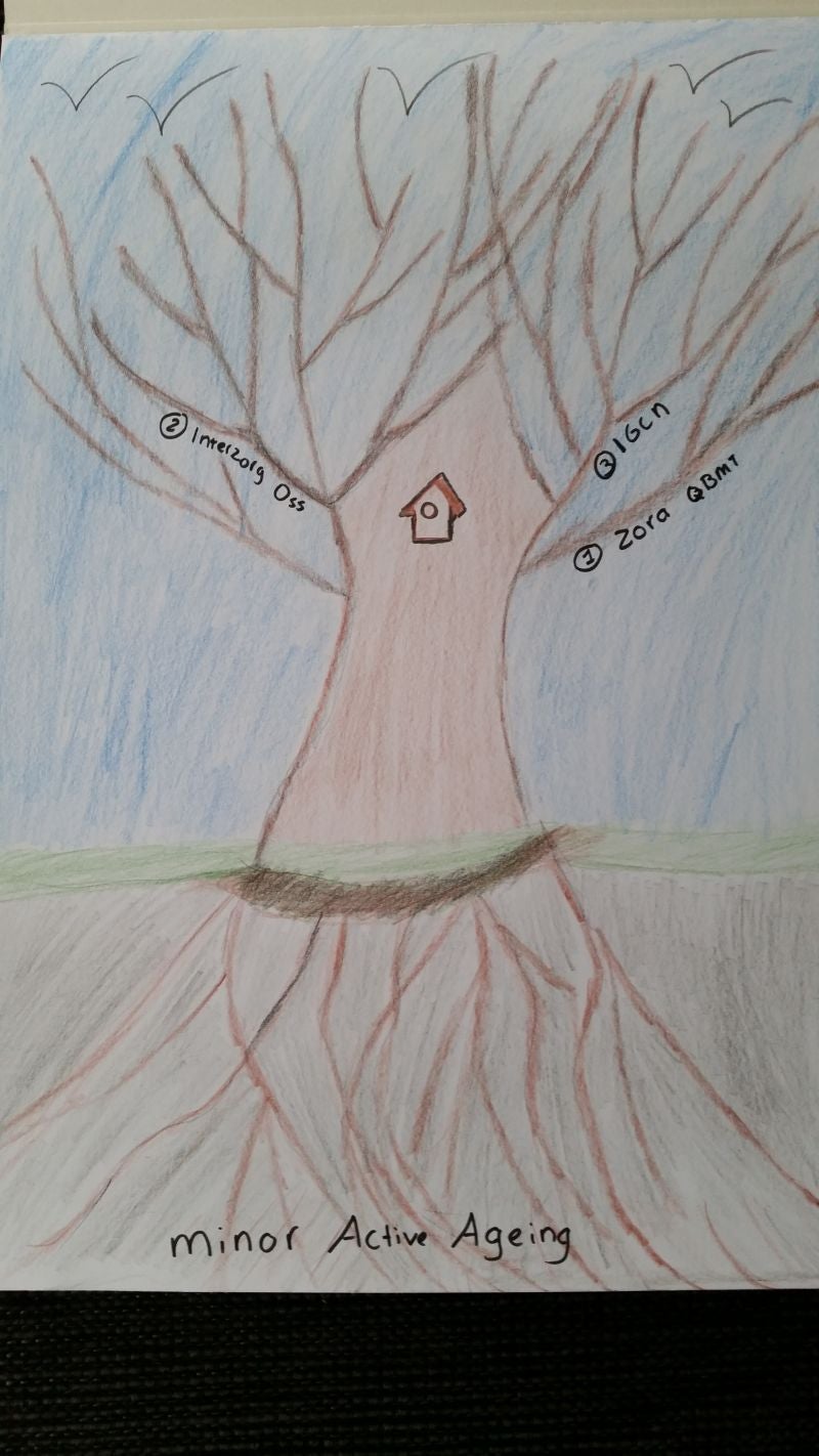 Om een beeld te krijgen binnen de minor is er een opdracht gekomen om een zorgkaart te maken. Hierin moet je zetten met wie je in contact komt en waarvoor. Dit mag op een creatieve manier gedaan worden. Ik heb er voor gekozen om een boom te maken. De wortels zijn het begin, de minor Active Ageing. Daarna groeit de boom en in de takken is te zien met welke instellingen/bedrijven ik binnen de minor contact heb gehad. Hieronder is de boom te zien: